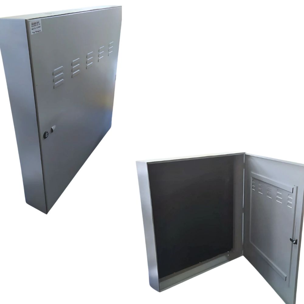 - Componentes Internos: Placa de madeira no fundo para fixação dos equipamentos.