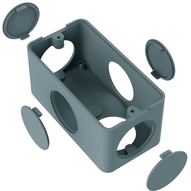 O Condulete Pvc Tipo E Cinza 3/4" Com Saida Encaixe E Tampa P/ 2 Teclas, é um conjunto de componentes utilizado para criar um ponto elétrico aparente (sobreposto), geralmente para controle de iluminação, em instalações que não podem ser embutidas na parede.